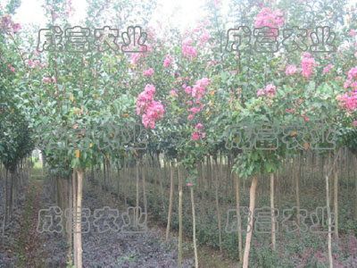 紫薇:屬落葉灌木或小喬木。在江蘇紫薇基地人工培育,數量大。紫薇為小喬木,有時呈灌木狀,高3~7米;樹皮易脫落,樹干光滑。幼枝略呈四棱形,稍成翅狀。葉互生或對生,近無柄;橢圓形、倒卵形或長橢圓形,長3~7厘米,寬2.5~4厘米,光滑無毛或沿主脈上有毛。圓錐花序頂生,長4~20厘米;花徑2.5~3厘米;花萼6淺裂,裂片卵形,外面平滑;花瓣6,紅色或粉紅色,邊緣有不規(guī)則缺刻,基部有長爪;雄蕊36~42,外側6枚花絲較長;子房6室。蒴果橢圓狀球形,長9~13毫米,寬8~11毫米,6瓣裂。種子有翅;ㄆ6~9月,果期7~9月。 樹干愈老愈光華,用手撫摸,全株微微顫動,故又稱為入驚兒樹、癢癢樹。 同時也是山西晉城市市花。